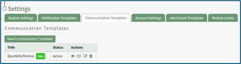 To create a new communication template, go to the Communication Templates Tab on the Settings Page of the Communications Module.