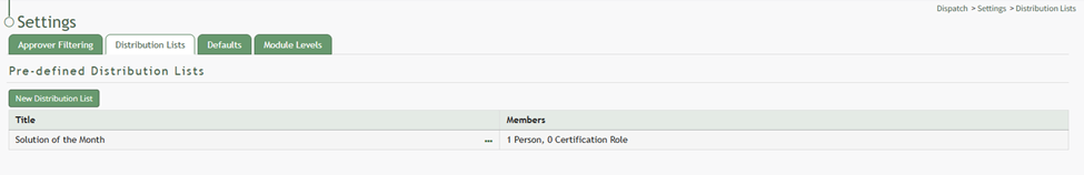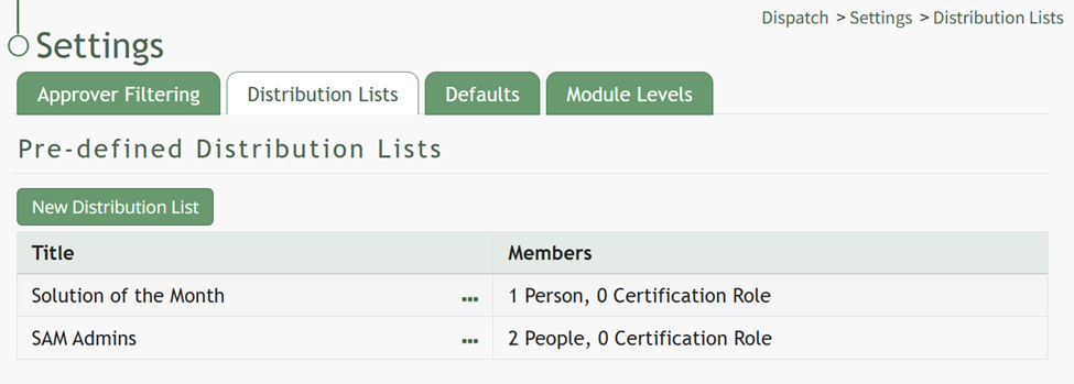 To create a new pre-defined distribution list, go to the Distribution Lists Tab on the Settings Page of the Dispatch Module.