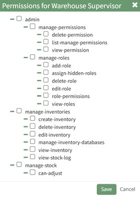 Users can select which permissions are allowed for a customized module levels. Select the Permissions icon (the bullet point list to the right of the eye) in order to assign the permissions the new Module Level would have within the Inventory Module.