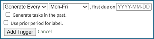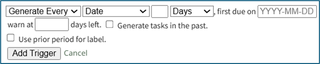 When a task has a Generate Every Period, the task no longer utilizes a repeating trigger. A new, one-off task will be created (with the same details as the task currently being created) whenever the previous task's parameters are met.