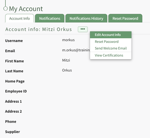 Select the three-dot icon opening the context menu and select “Edit Account Info”. This enables you to edit your own account information. Enter the page URL in this field if you wish to start on a different page than the Dashboard. For example, if you’d like to start in the Documents Module after login, set Home Page to: https://sitename.kastrack.com/r/documents.