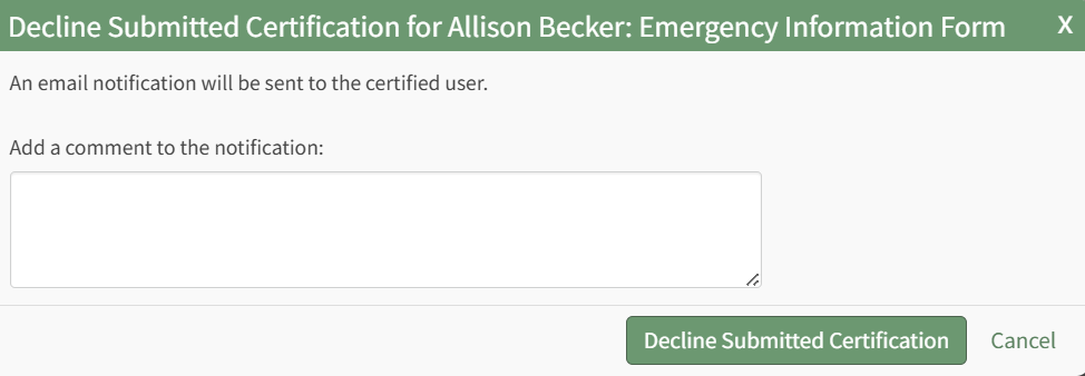 The system will send an email notification to the certified user. You can add comments that will be added to the notification email in the modal.