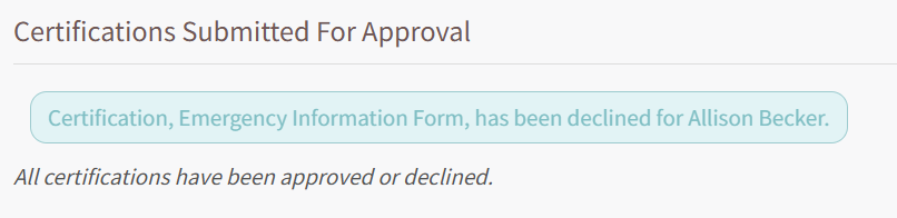 A textbox confirms that the certification was declined and the certification is removed from the Submitted Certifications Table.