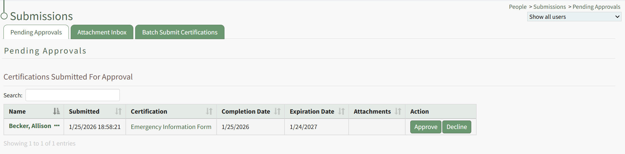 To decline a submitted certification that is pending approval, open the Pending Approvals Tab on the Submission Page of the People Module from the Main Menu.