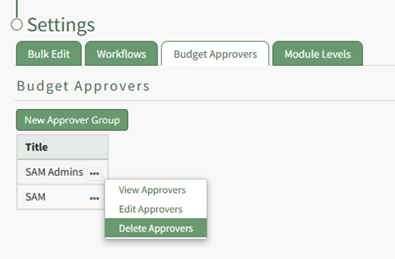 To delete a budget approver group, go to the Budget Approver Tab on the Settings Page of the Actions Module. Click the three dot icon to the right of the Budget Approver Group Title opening the Budget Approver Table Context Menu.