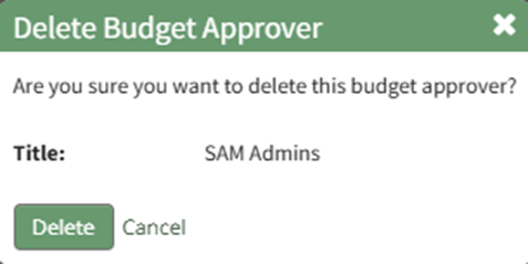 Select the option to “Delete Approvers” opening the Delete Budget Approver Confirmation Modal which states that title of the budget approver group being deleted and asks “Are you sure you want to delete this budget approver?”