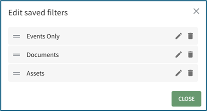 Selecting the edit filter icon will open the Edit Saved Filters Modal, where filters can be accessed for editing or deletion. | |