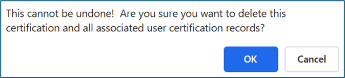 The modal states “This cannot be undone! Are you sure you want to delete this certification and all associated user certification records?” Click the “OK” button to permanently delete the certification.