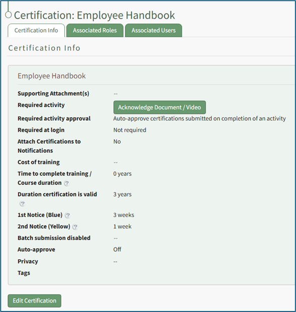 Select the “Edit Certification” button to open the Edit Certification Info Page, which is comprised parameters from five sections.