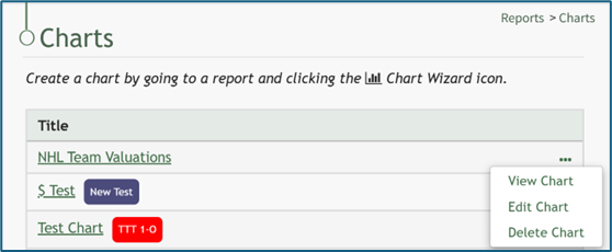 Click the three-dot icon to the right of the chart you wish to delete, and select the “Delete Chart” option. This opens the Delete Chart Confirmation Modal which states, “Are you sure wish to delete this chart?” The modal also states the title of the chart being deleted.