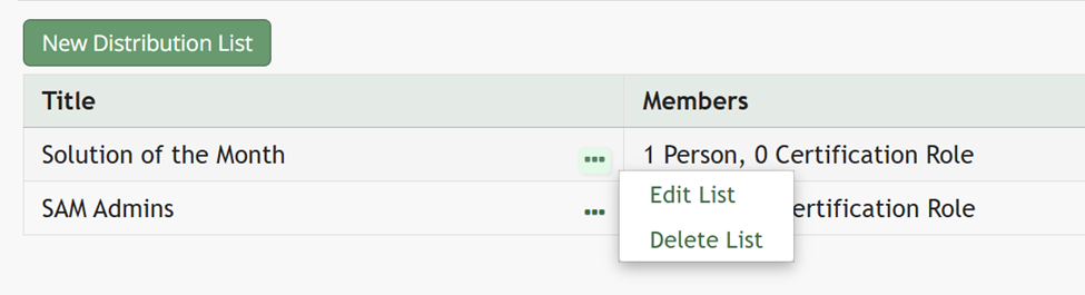 Selecting the three-dot icon to the right of the distribution list title you wish to delete will open the Pre-Defined Distribution List Table Context Menu.
