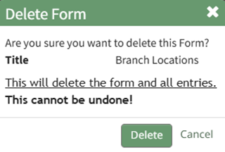 Select “Delete Form” opening the Delete Form Confirmation Modal which displays the Form Title and states, “Are you sure you want to delete this Form? This will delete the form and all entries. This cannot be undone!”