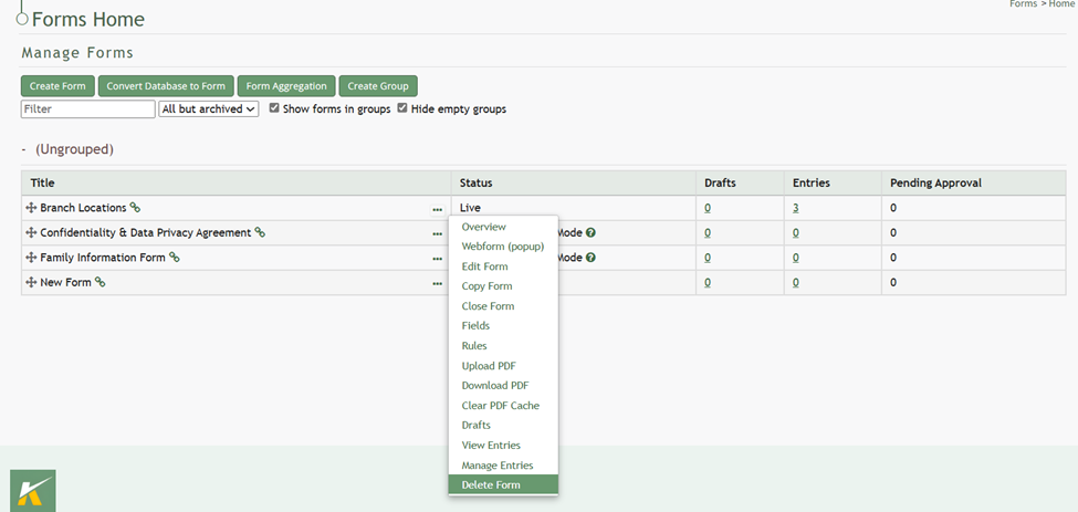 To delete a form, go to the Home Page of the Forms Module. Click the three dot (…) icon to the right of the form you want to delete to open the Form’s context menu.