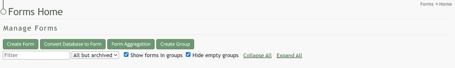 To delete a form aggregation, open the Home Page of the Forms Module from the Main Menu.