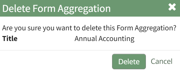 The modal states the form aggregation title and asks, "Are you sure you want to delete this Form Aggregation?" Click the Delete button and the aggregation is removed from the table.