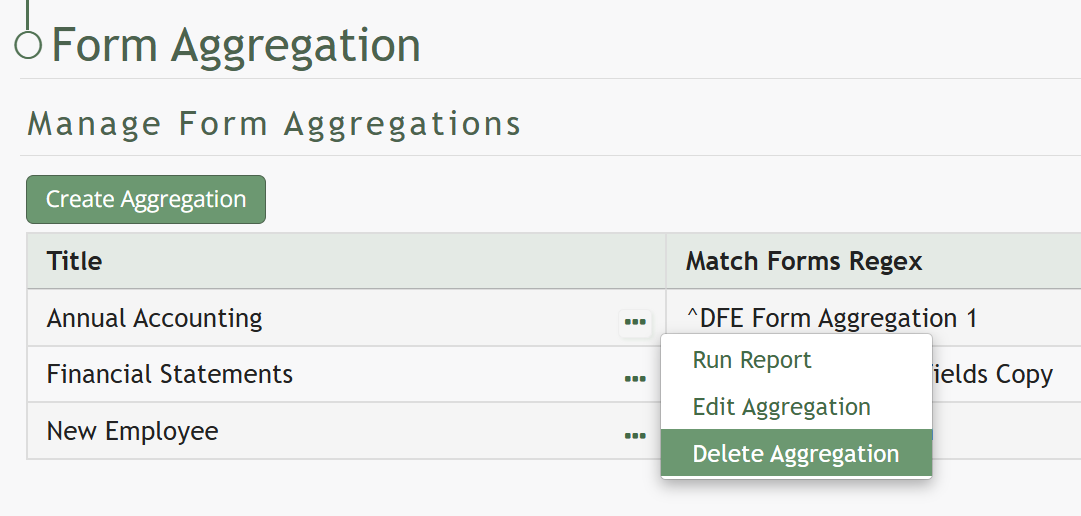 Select the option to Delete Aggregation opening the Delete Form Aggregation Modal.