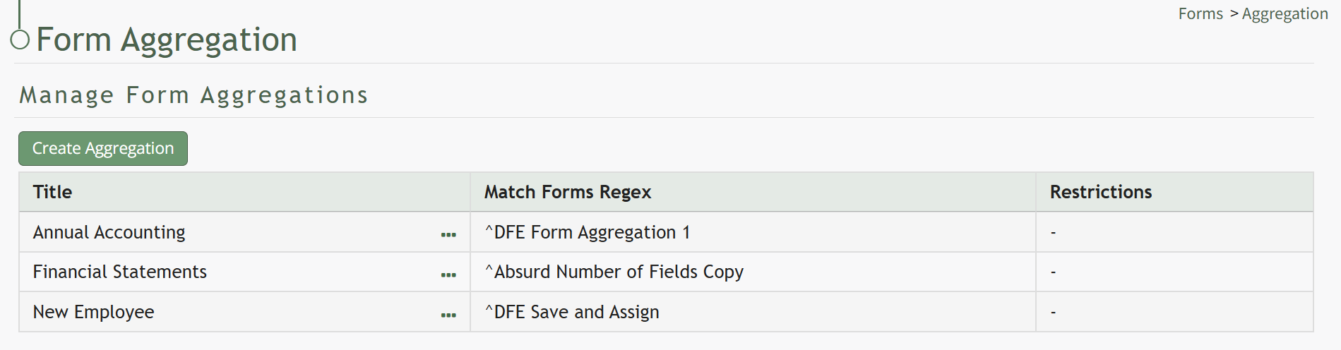 Click the Form Aggregation button opening the Form Aggregation Page.