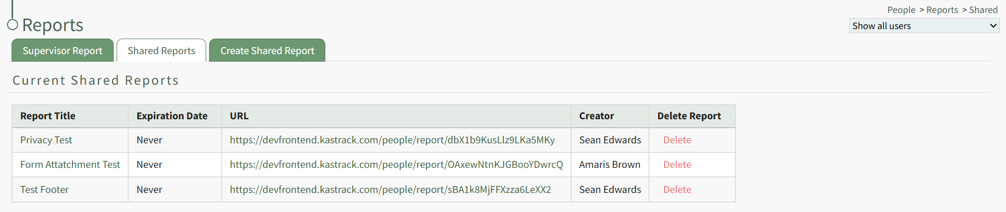The Delete Report column of the Current Shared Reports Table houses a clickable red Delete link.