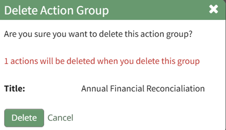 The modal displays the title of the action group that will be deleted, as well as the number of actions that will be deleted when you delete the group.