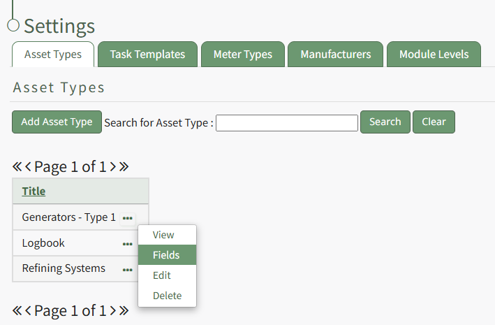 To delete an asset type field, go to the Asset Types Tab on the Settings Page of the Assets Module. Click the three-dot icon to the right of the asset type that contains the asset type field you wish to delete opening the Asset Type Context Menu.