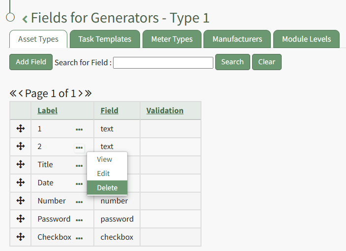 Select "Delete" from the context menu opening the Delete Asset Type Field Confirmation modal. Select "Delete" and the field is removed from the Asset Type Fields Table.