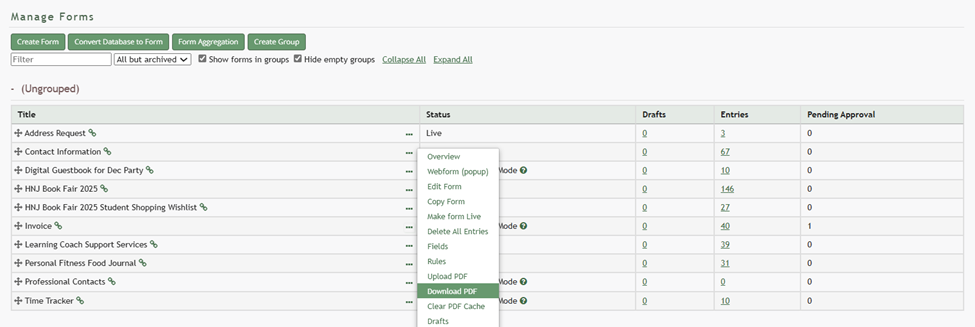 To download a specific form PDF, go to the Home Page of the Forms Module and click the three-dot icon to the right of the Form Title opening the Form Table context menu.