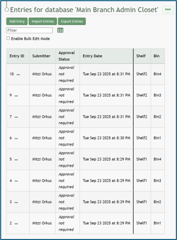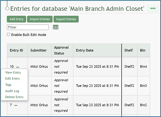 Select “Manage Entries” from the context menu opening the Entries for database (DatabaseName) Page.