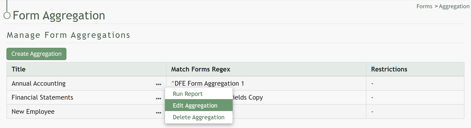 Click the three-dot icon to the right of the aggregation you wish to edit opening the Aggregation Context Menu and select the Edit Aggregation option. This opens the Edit Form Aggregation Modal.
