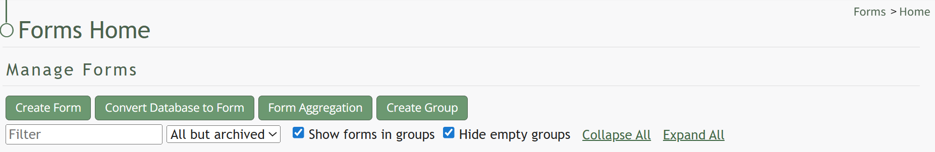 To edit a form aggregation, open the Home Page of the Forms Module and click the Form Aggregation beneath the page header.