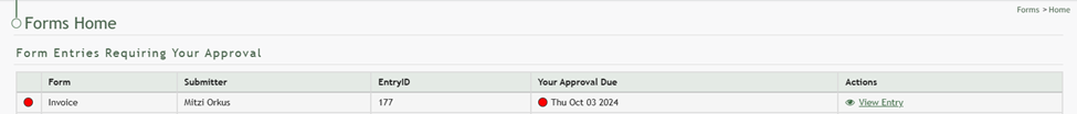 Select “View Entry” from the Actions column of the Form Entries Pending Approval Table opening the view form entry modal.