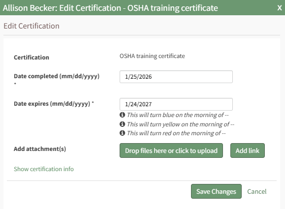 Editing the completion date will result in the system editing the certification expiration date. Select the Save Changes button.