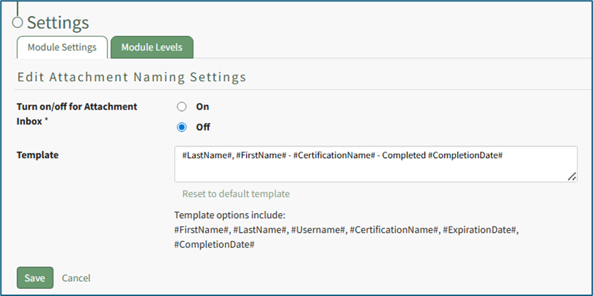 Select “Save” to update the Attachment Naming Settings or “Cancel” go back to the Module Settings tab on the Settings Page.