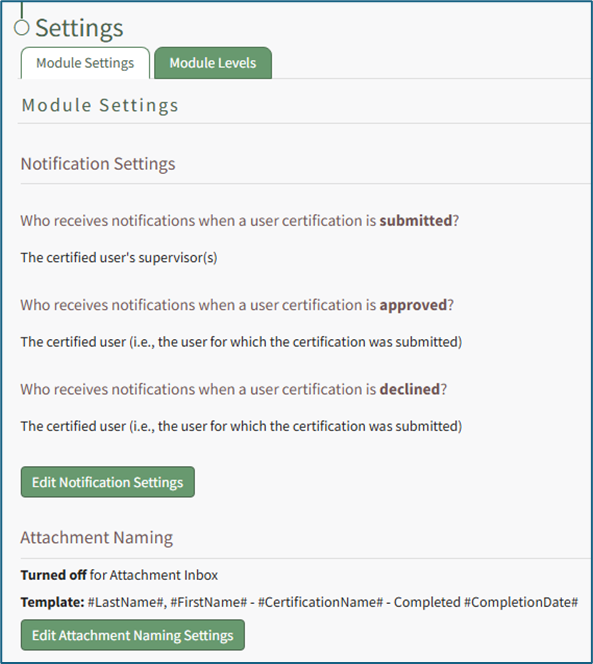 The default template for Attachment Naming Settings is: Last Name, First Name, Certification Name – Completed, Completion Date