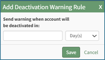 Specify how far in advance of deactivation an alert should be sent by inputting a numerical value into the textbox, and then select the units (days, weeks, months, or years) from the dropdown menu. Click “Cancel” to return to the editable Inactive Accounts Page without creating a new warning rule. Select “Save’ and the new deactivation warning rule will show in the editable Inactive Accounts Page.
