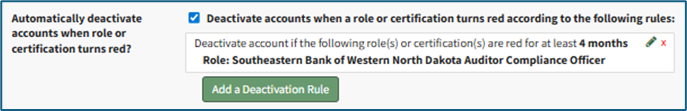 To deactivate an account when a role or certification turns red, select the checkbox to the right of “Automatically deactivate accounts when role or certification turns red?” Select the “Add a Deactivation Rule” button, opening the Add Account Deactivation Rule Modal.