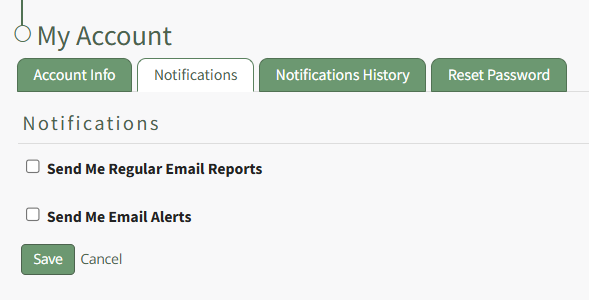 If you are not altering your email alert status, select the “Save” button to save your email report notification preferences. Clicking “Cancel” will not save changes and revert back to the previously saved preferences on the Notifications Tab of the My Account Page.