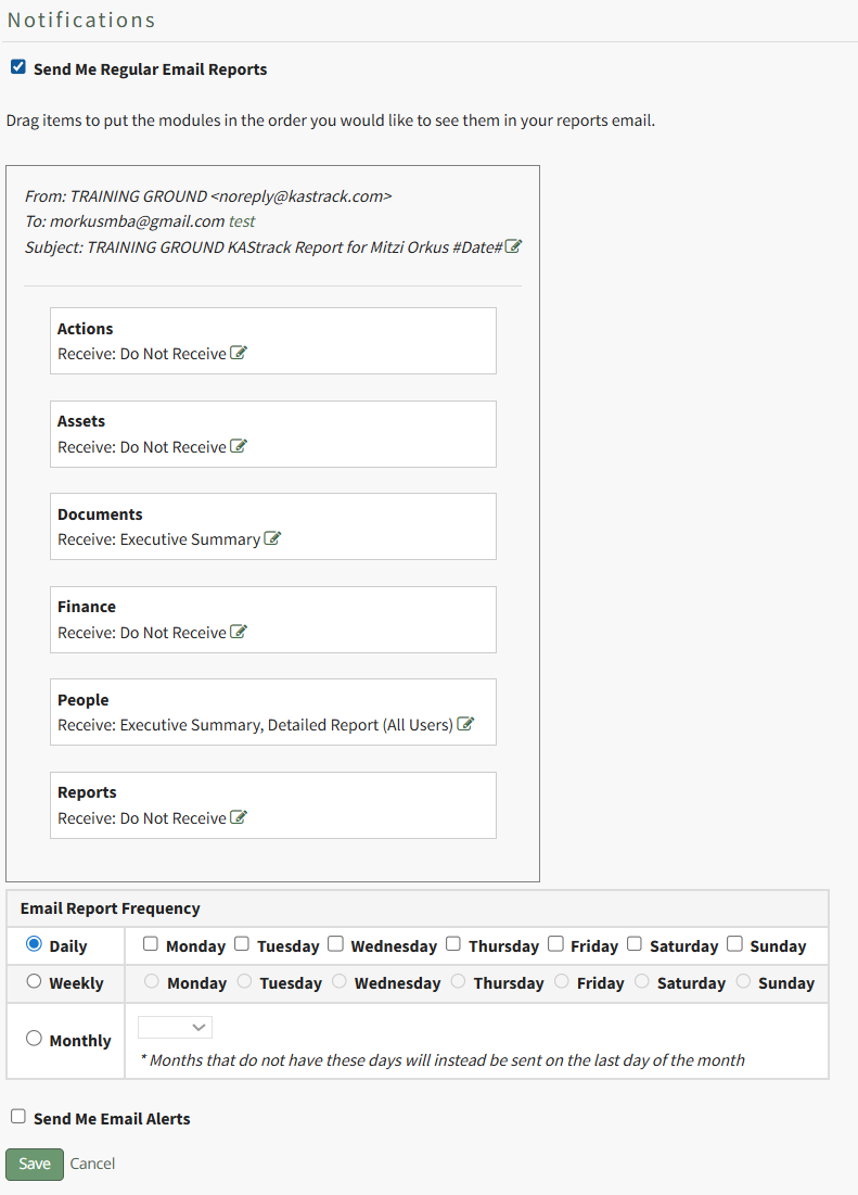KAStrack users can customize the frequency of their e-mail report notifications on a daily, weekly, or monthly basis.