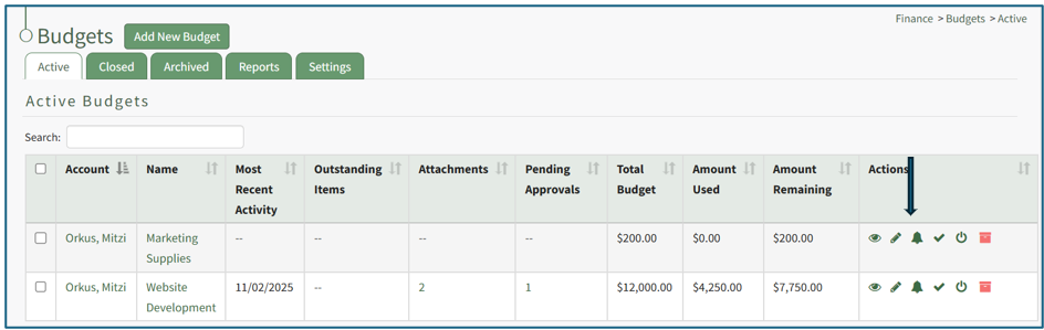 Only active budgets can be edited. To edit a budget, go to the Active Tab of the Budgets Page in the Finance Module. Click the pencil icon in the Actions column of the Active Table.