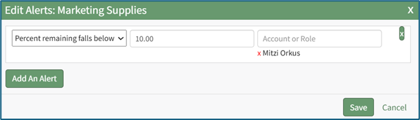An alert can be based on when the amount remaining in the budget falls below a specified amount or when the amount remaining in the budget falls below a specified percent.