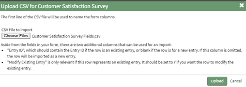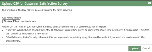 Click the “Import Entries” button beneath the page header. This opens the Upload CSV for (FORM NAME) Modal.