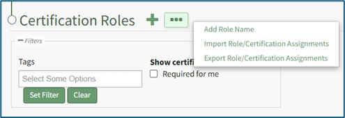 Certification assignments to Certification Roles can be imported in bulk into KAStrack. Select the Roles Page in the People Module from the Main Menu to display the Certification Roles Table. Click the three dot (…) icon to open a context menu and select “Import Role/Certification Assignments”.