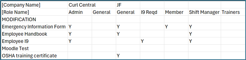 The third row of the template is labeled MODIFICATION. When using the downloaded template to import changes, each altered column must be marked with a capital ‘Y’ in the modification row to inform the system which roles have had changes made to their assigned certifications. (A warning will show when attempting to import if this is not done.)