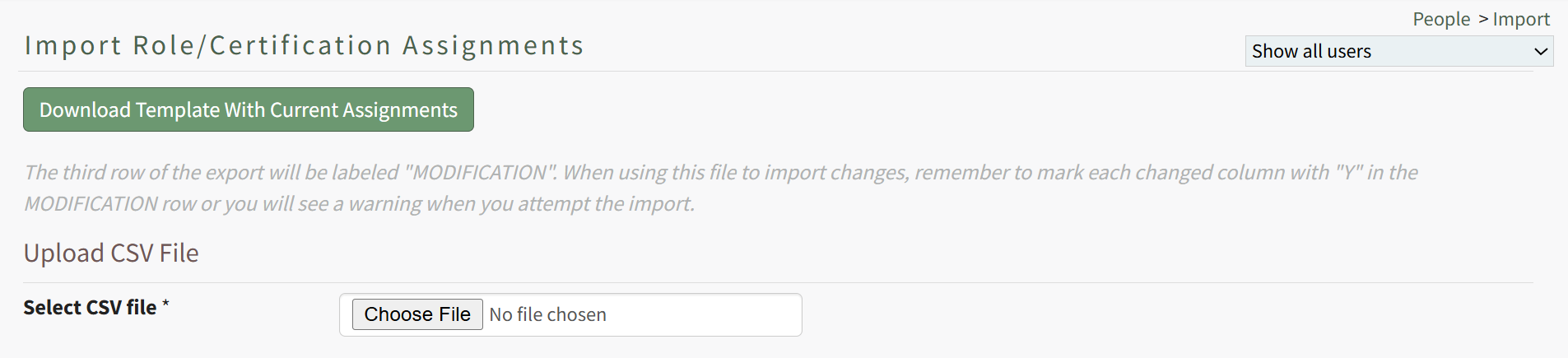 Click the “Download Template with Current Assignments” button to download the Role Certifications Template CSV to your device. This template includes the current assignment of Certifications to Certification Roles.