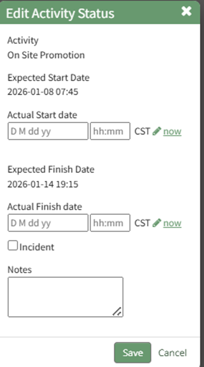 Hover the cursor over the itinerary activity. Select the clock icon to opening the Edit Activity Status Modal to edit start or finish information.