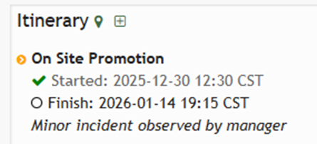 The yellow icon to the right of the Itinerary Activity title indicates that there was an incident.