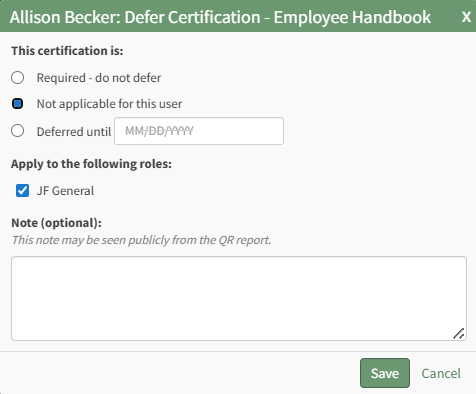Any notes made regarding the deferment on this modal will be publicly visible on the user's QR Report.