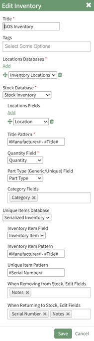 From this modal, the title, tags, integrated databases selected, and the formatting for the way inventory items are displayed in an inventory can be altered. Make your desired changes to the inventory properties.
