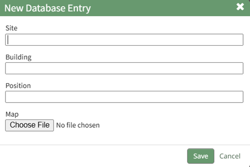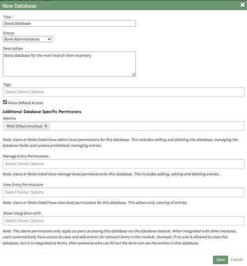 The New Database Entry Modal will vary for every database, based on the fields that have been created for it.