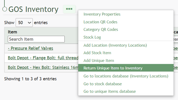 Select “Return Unique Item to Inventory” opening the Return to (InventoryName) Modal.