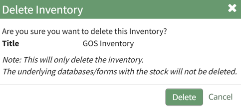 Select “Delete Inventory” from the context menu, opening the Delete Inventory Confirmation Modal. The modal states, “Are you sure you want to delete this inventory?"